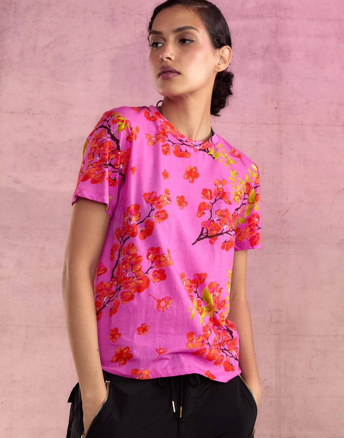 - Pink tee with red & orange floral cherry blossom print
