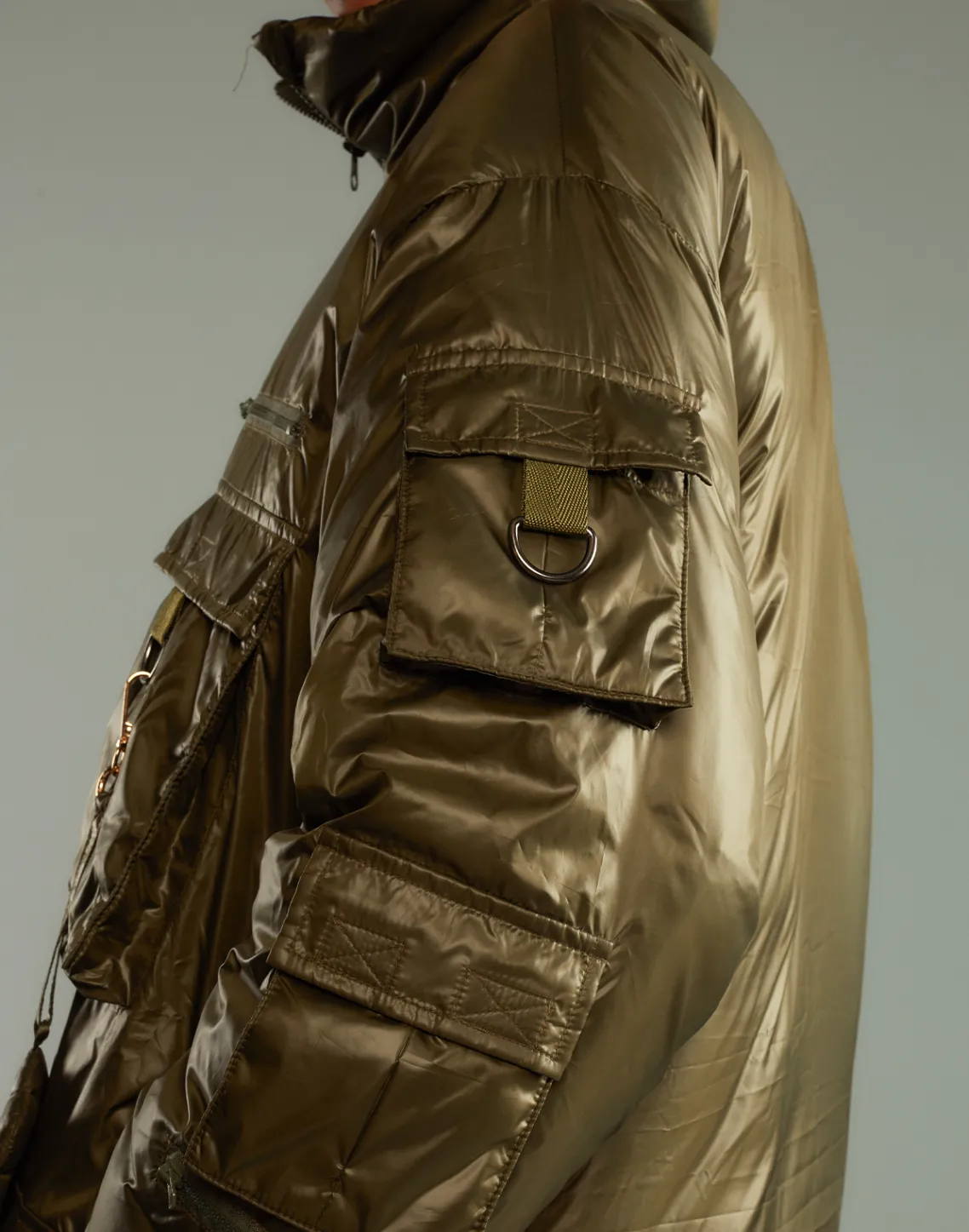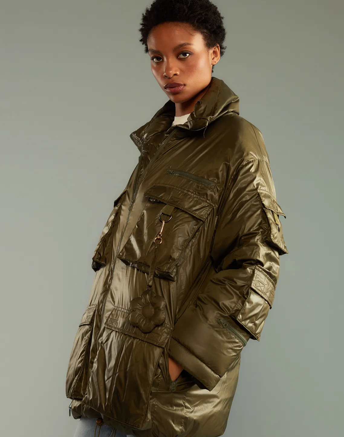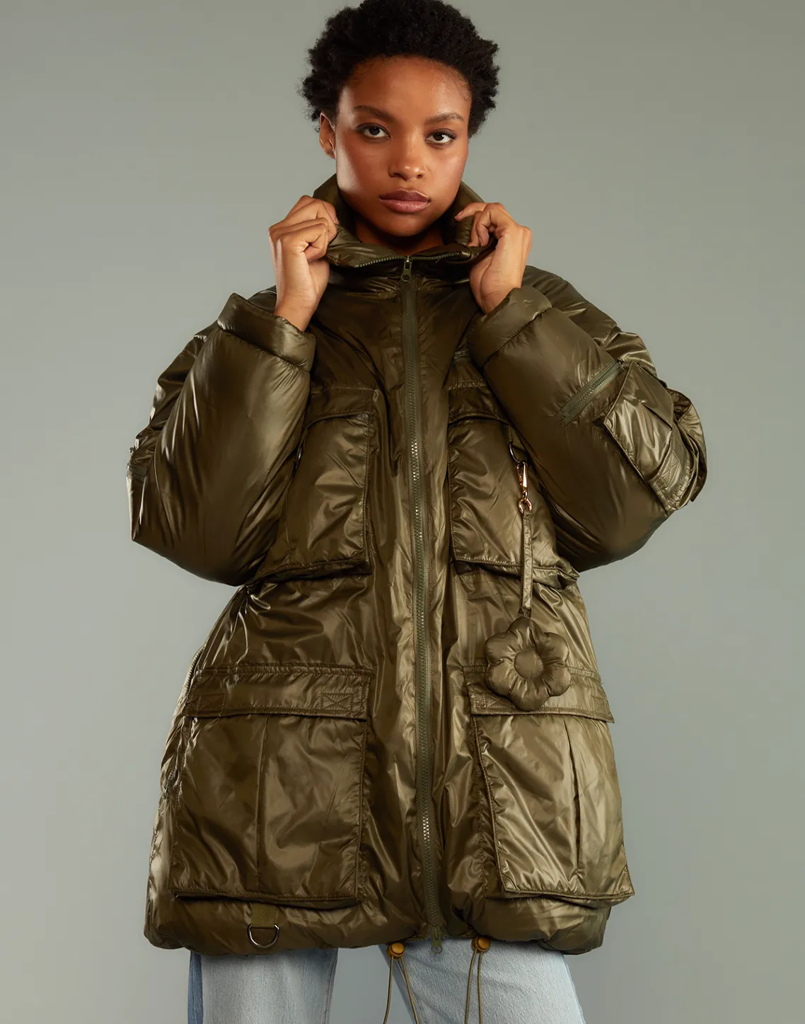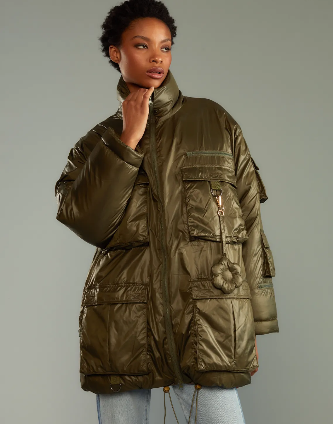 Pockets, pockets, pockets, olive green oversized down puffer coat.