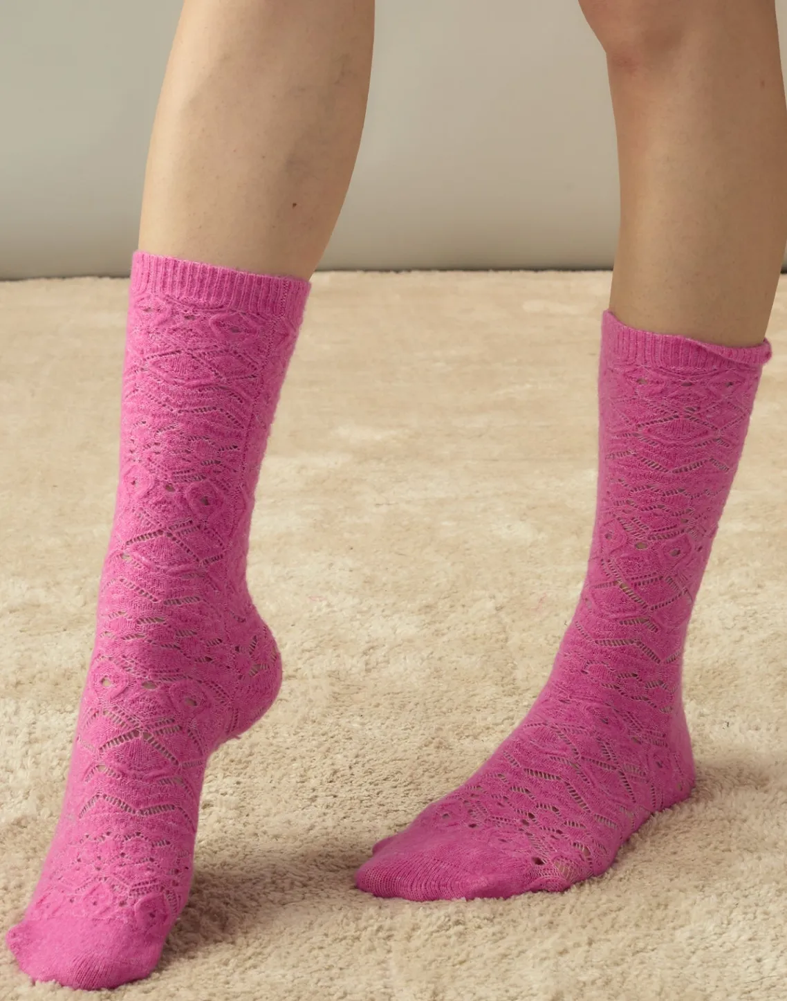 Pink cozy crochet wool blend calf socks.Calf length Super soft crochet wool blendFabric content: 48% Wool, 30% Polyamid…