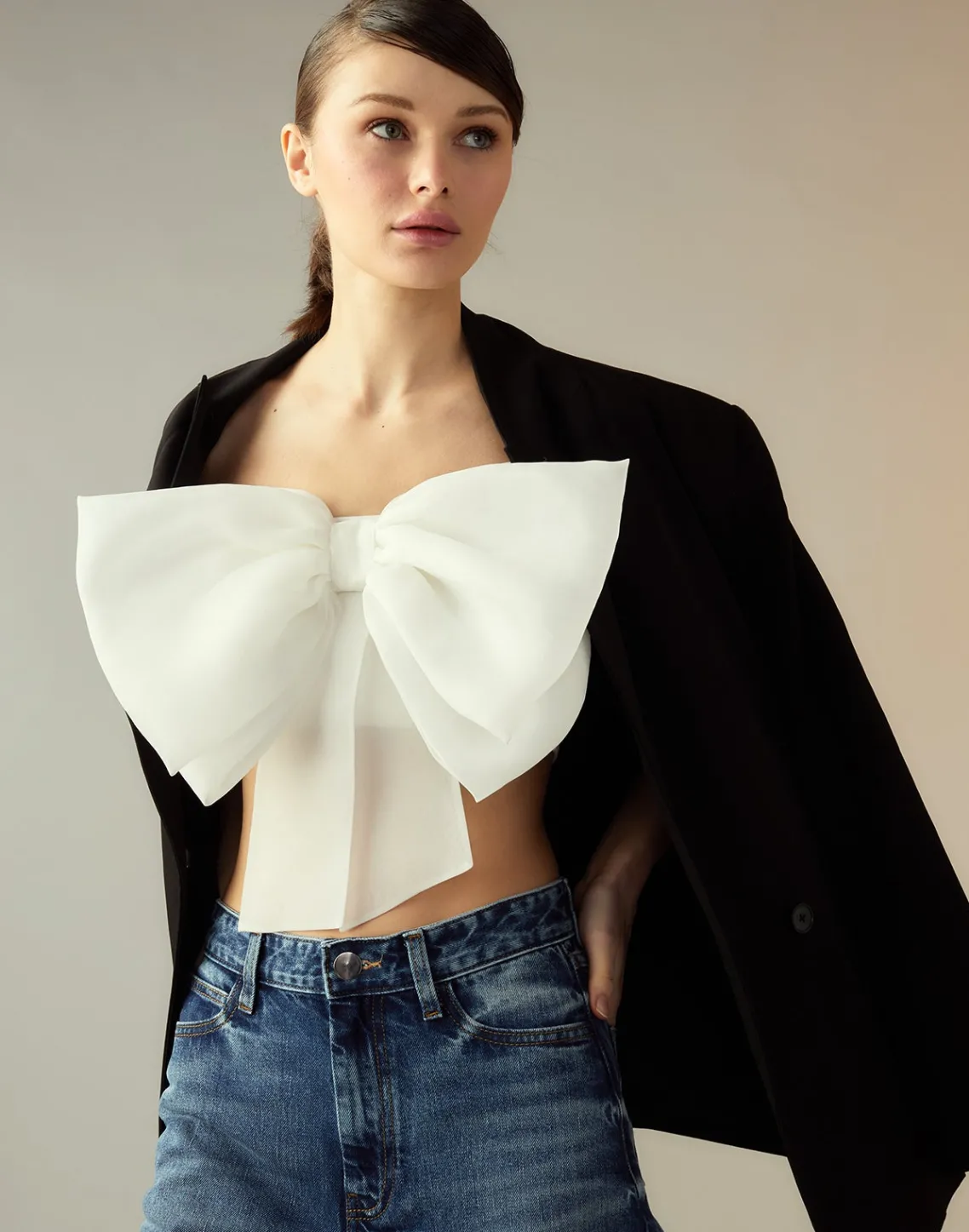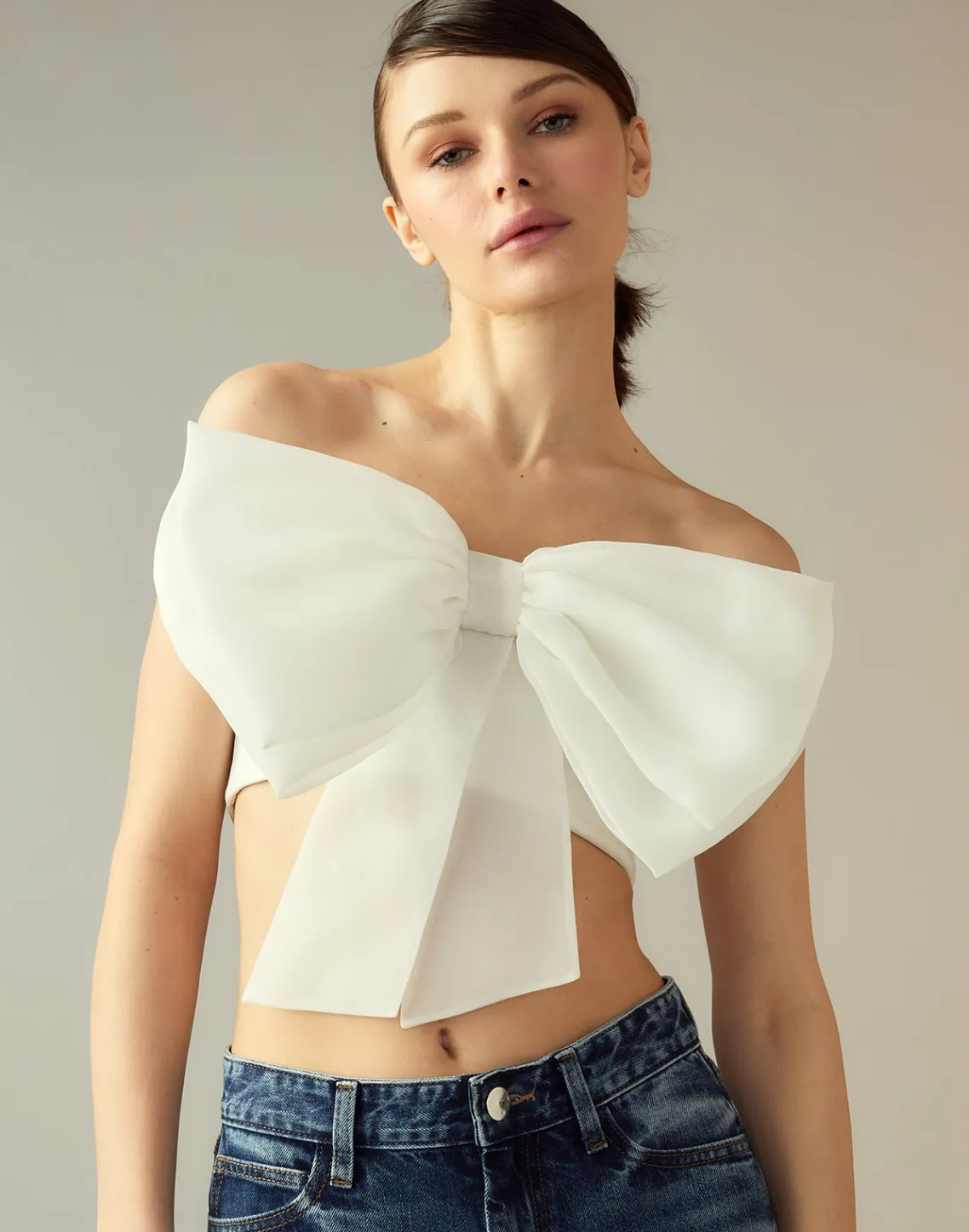 White oversized organza bow bandeau top.