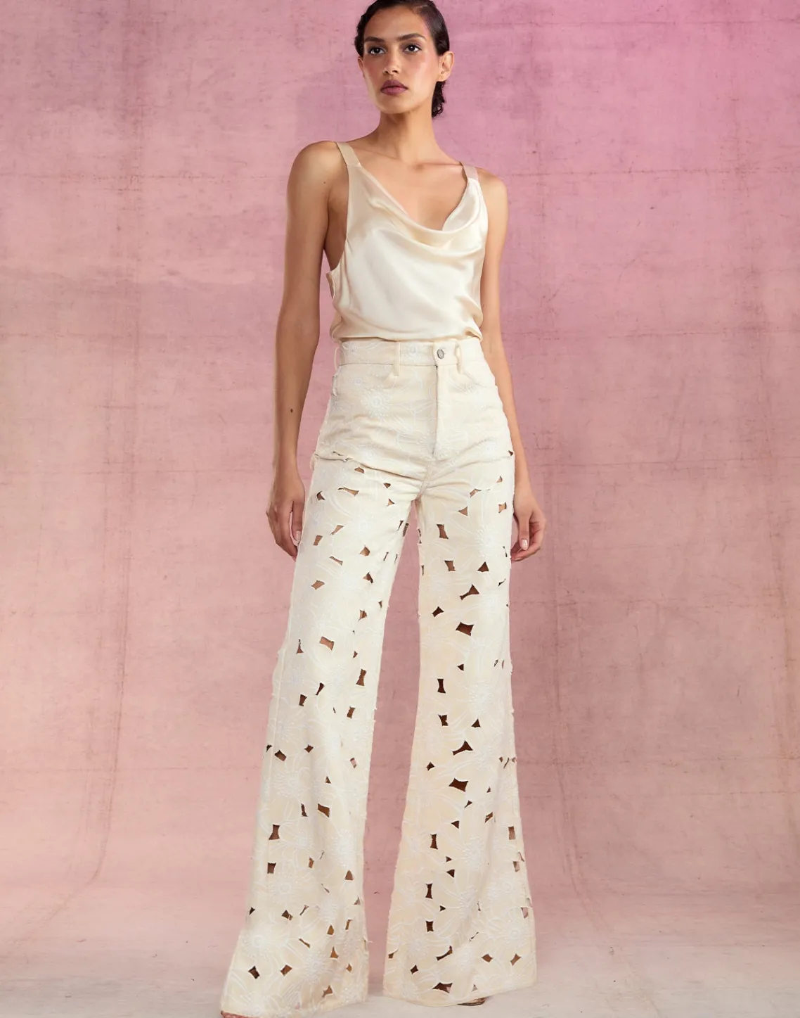 - Fitted throughout the waist, soft wide leg