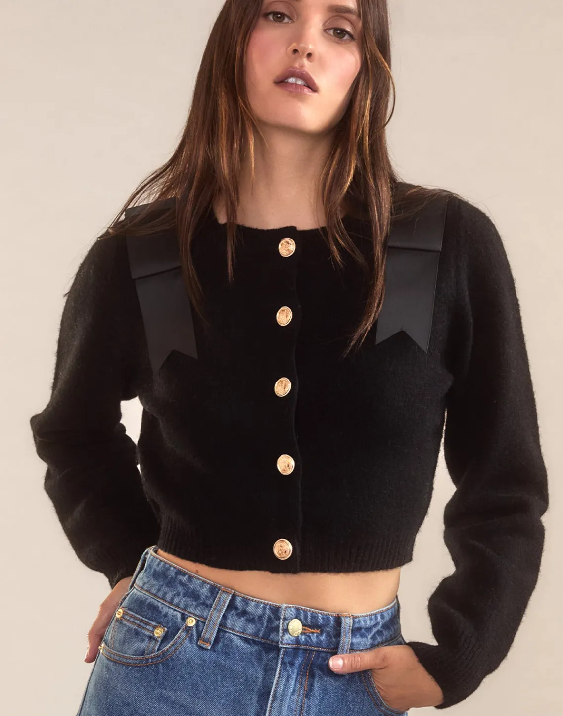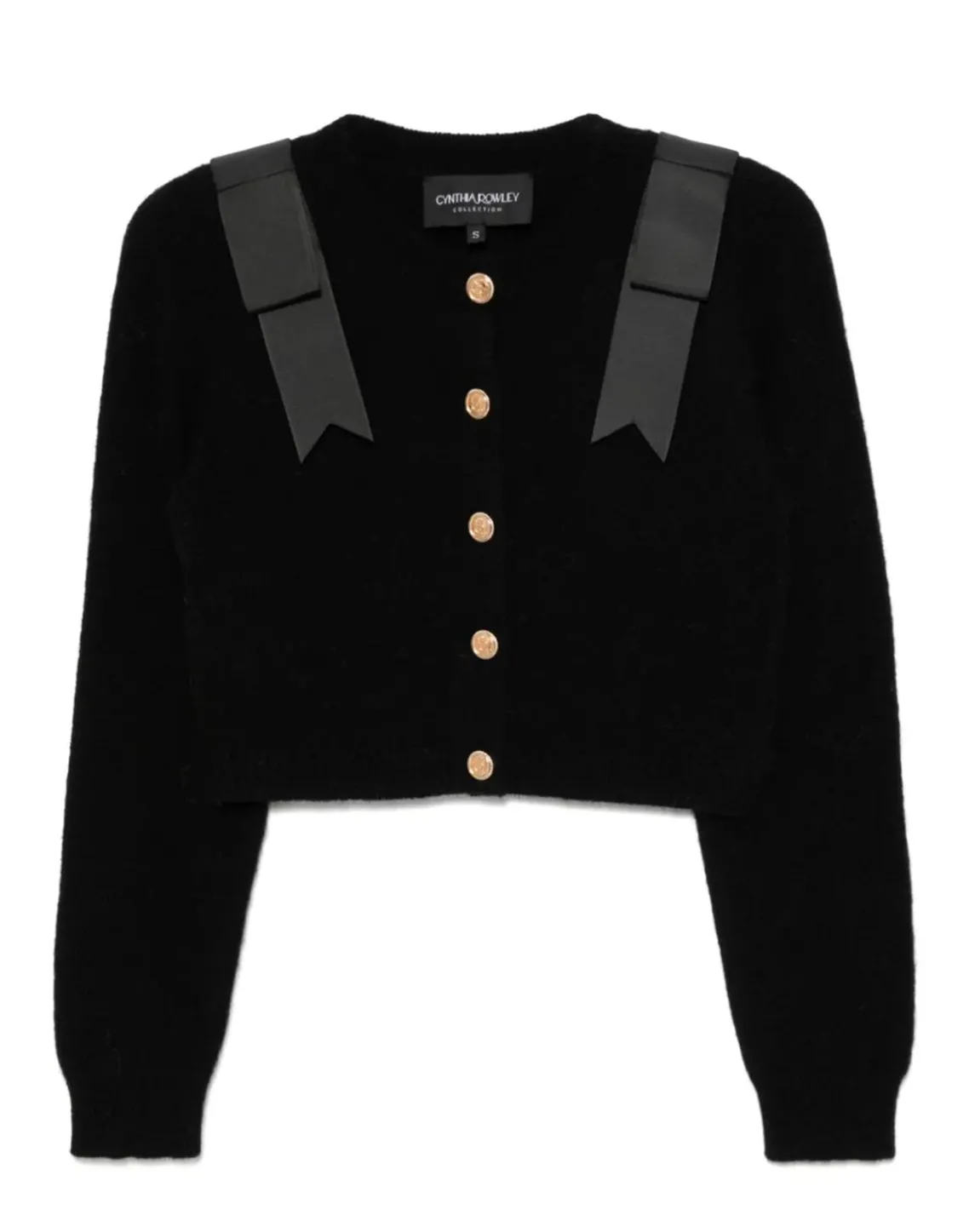 Black cropped wool cardigan with bow detail