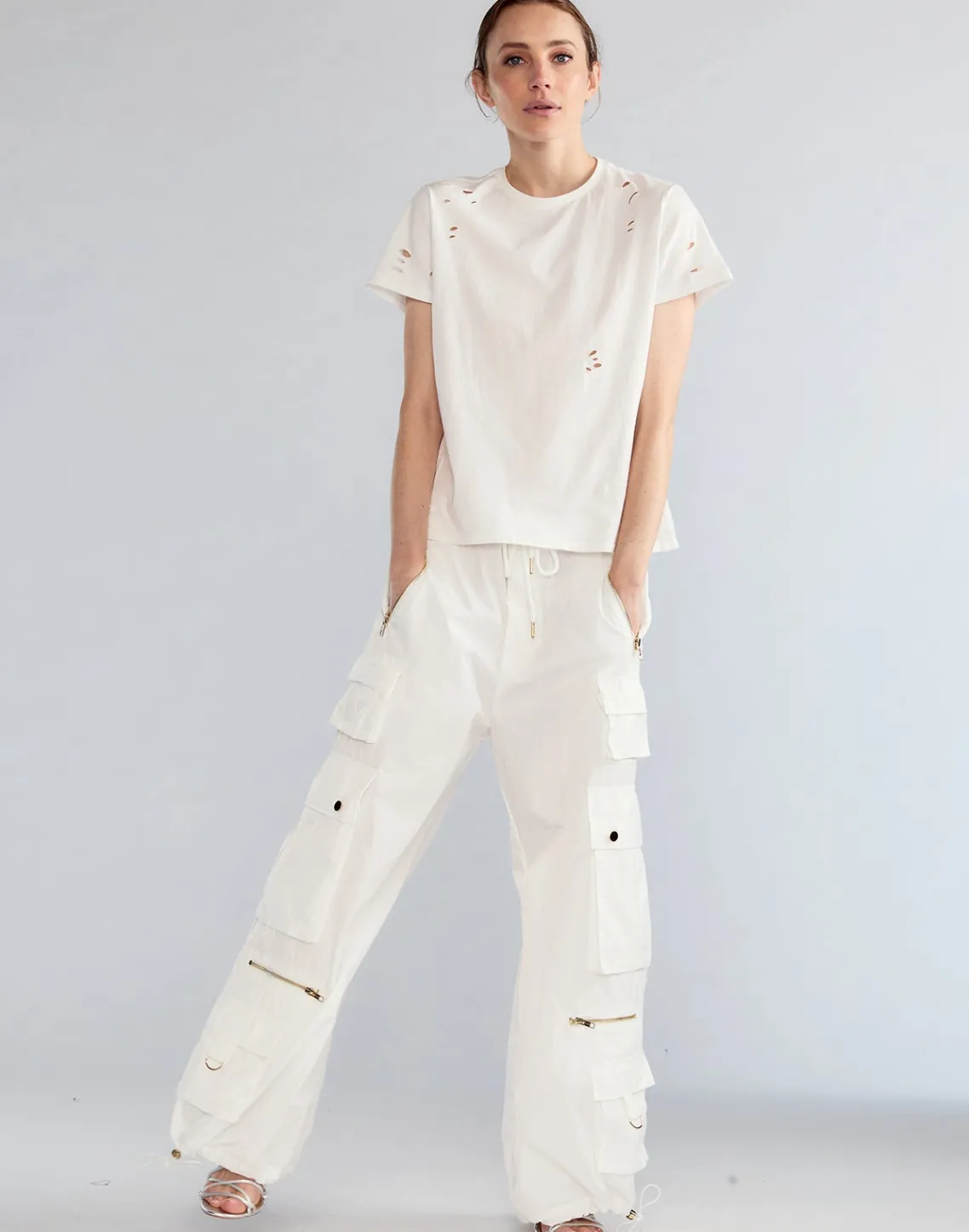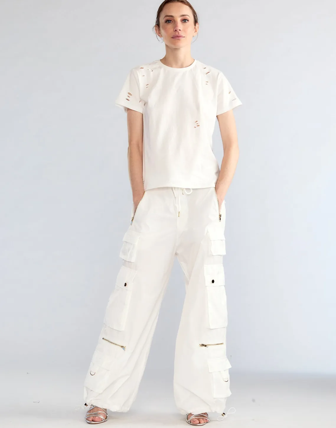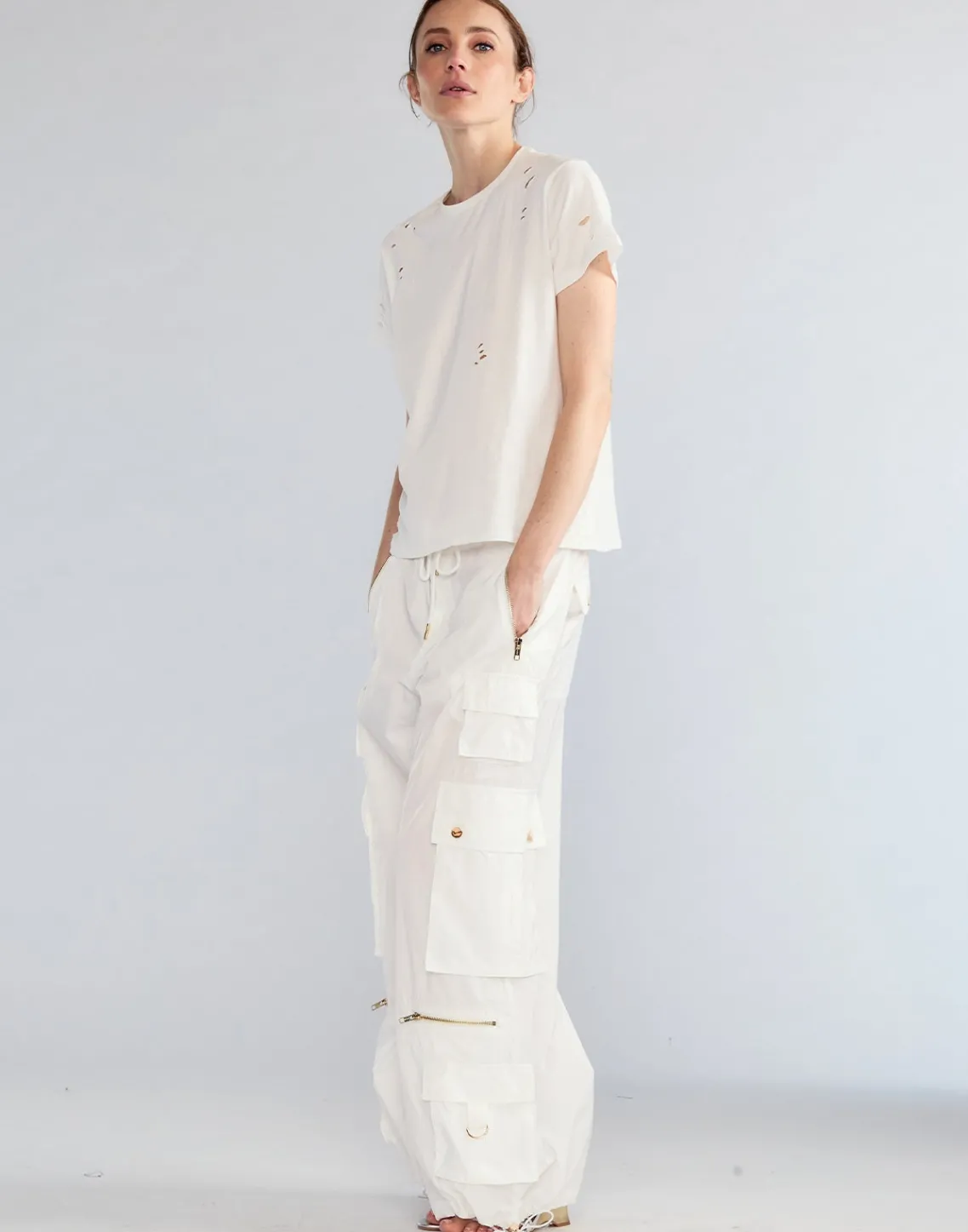 White nylon cargo pants.