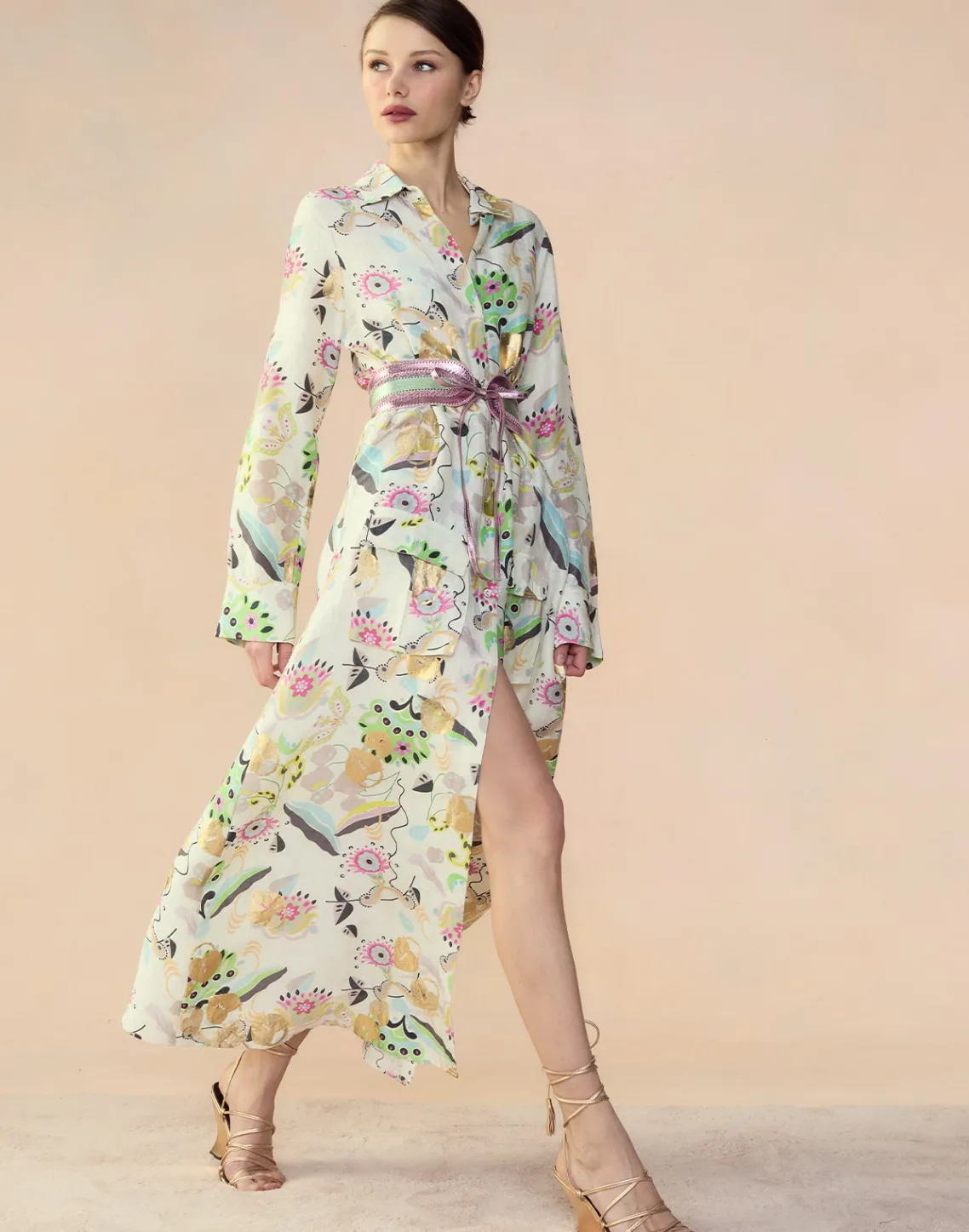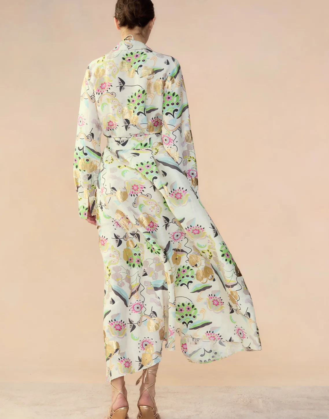 Love Locked linen and silk linen blend with gold foil shirt dress.