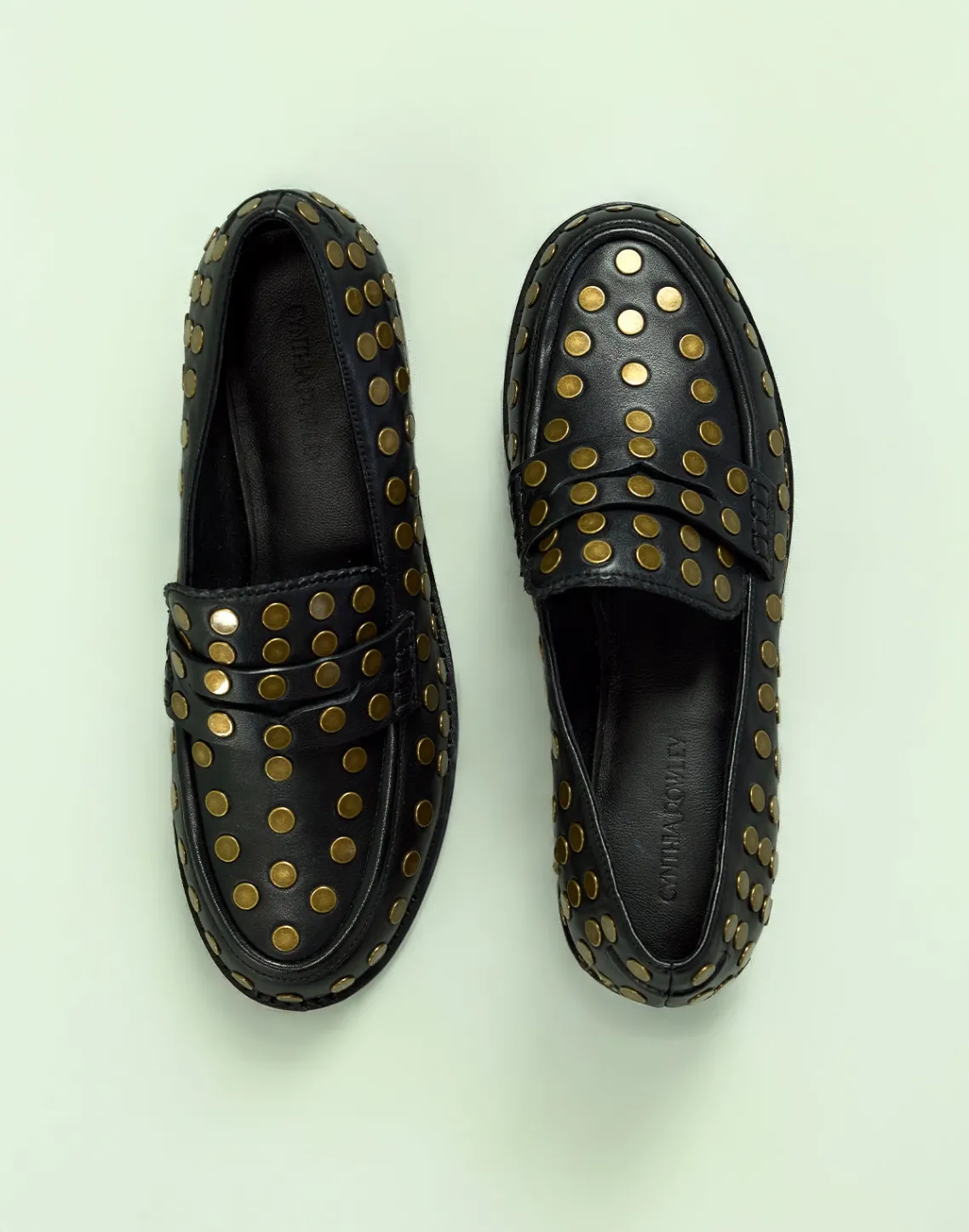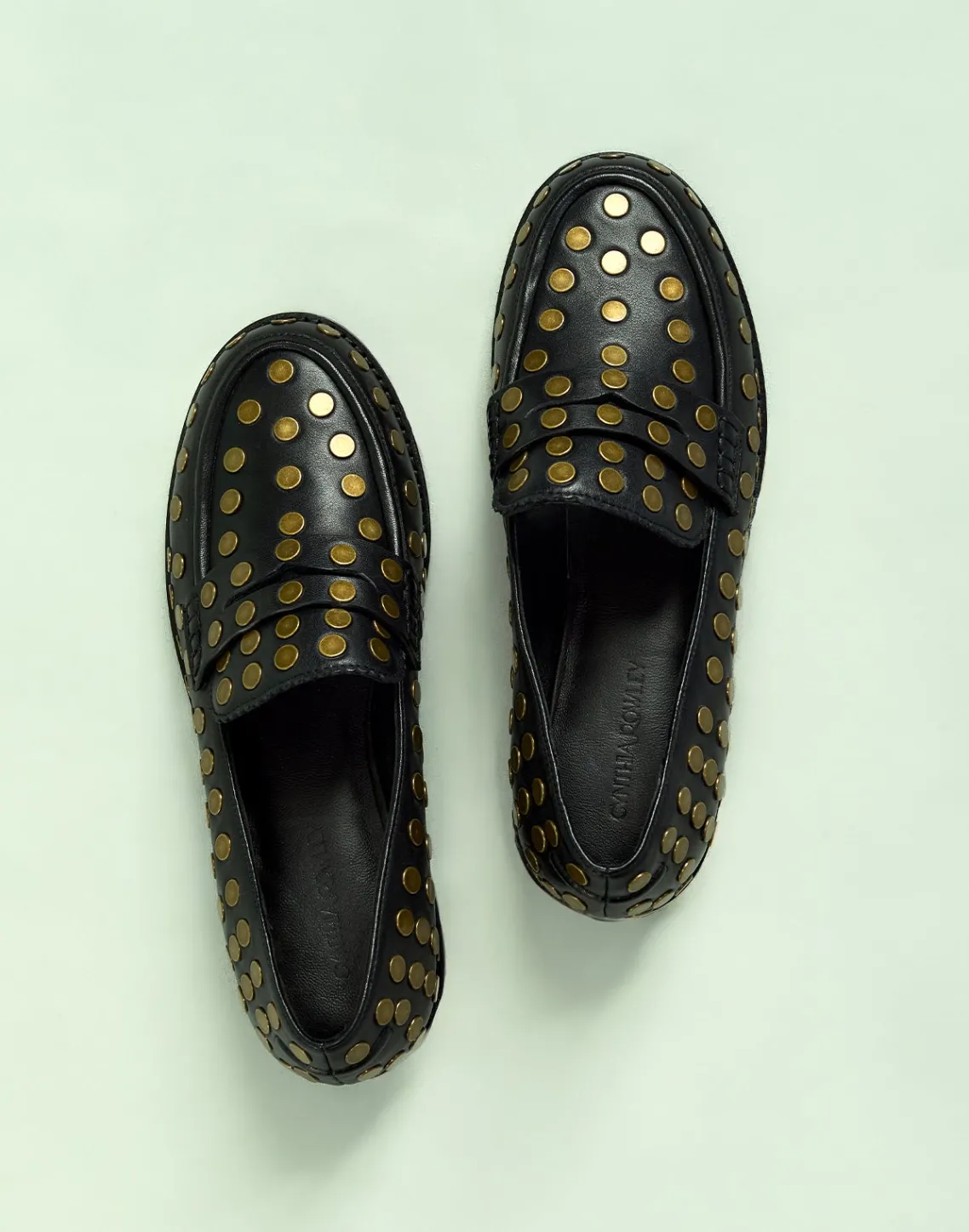 Black classic leather loafer with nail head detailsRounded almond toeSlip-on constructionAll over nail head flat studs i…