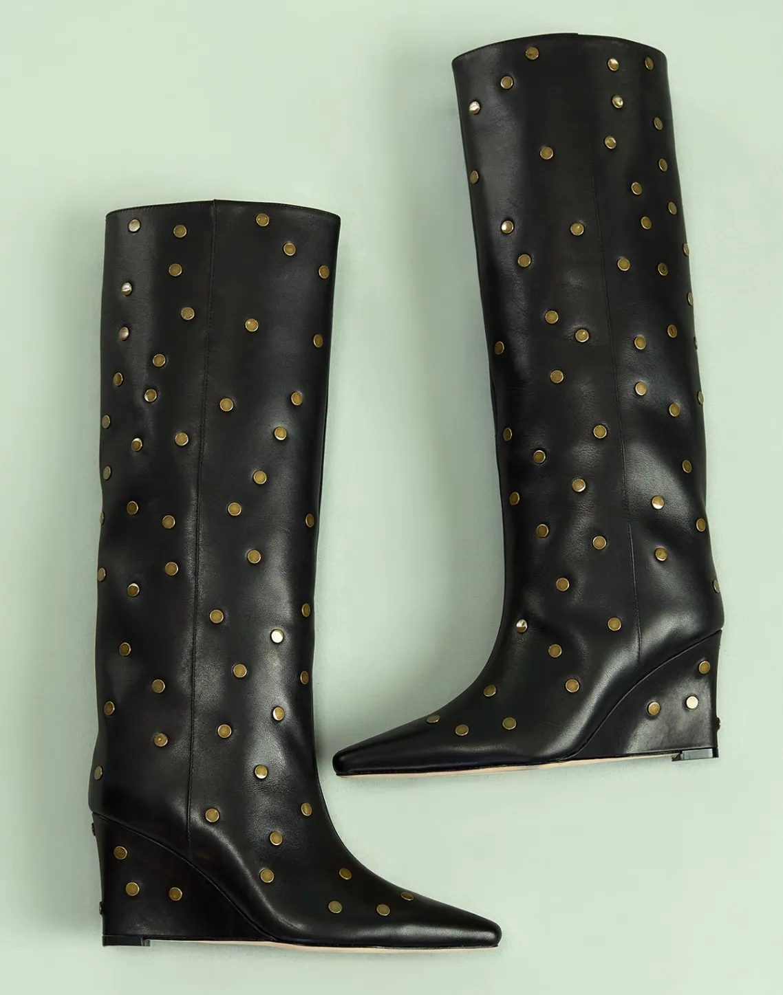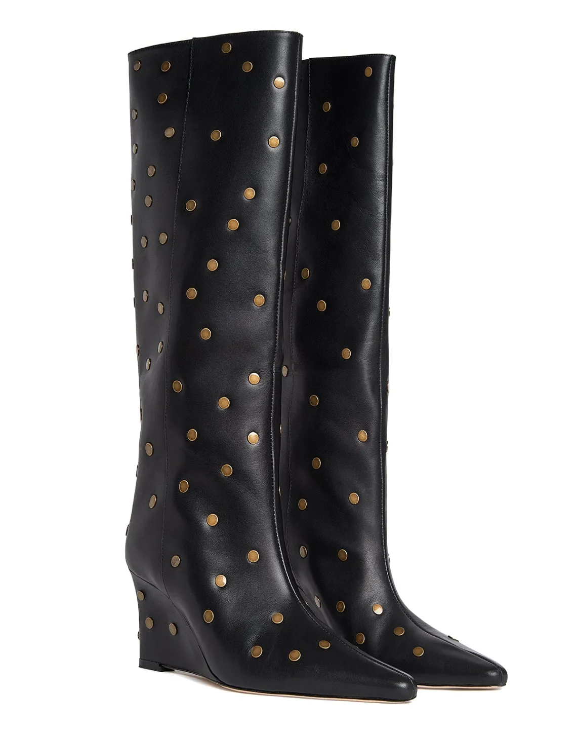 Black leather knee high wedge boot with all over brass nail head studsWedge heelKnee high Slip on stylePointed toeMade …