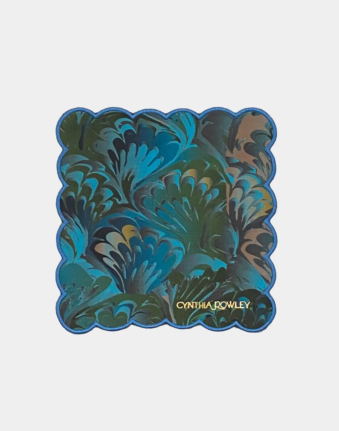Printed cotton cocktail napkins with scallop embroidered edge.