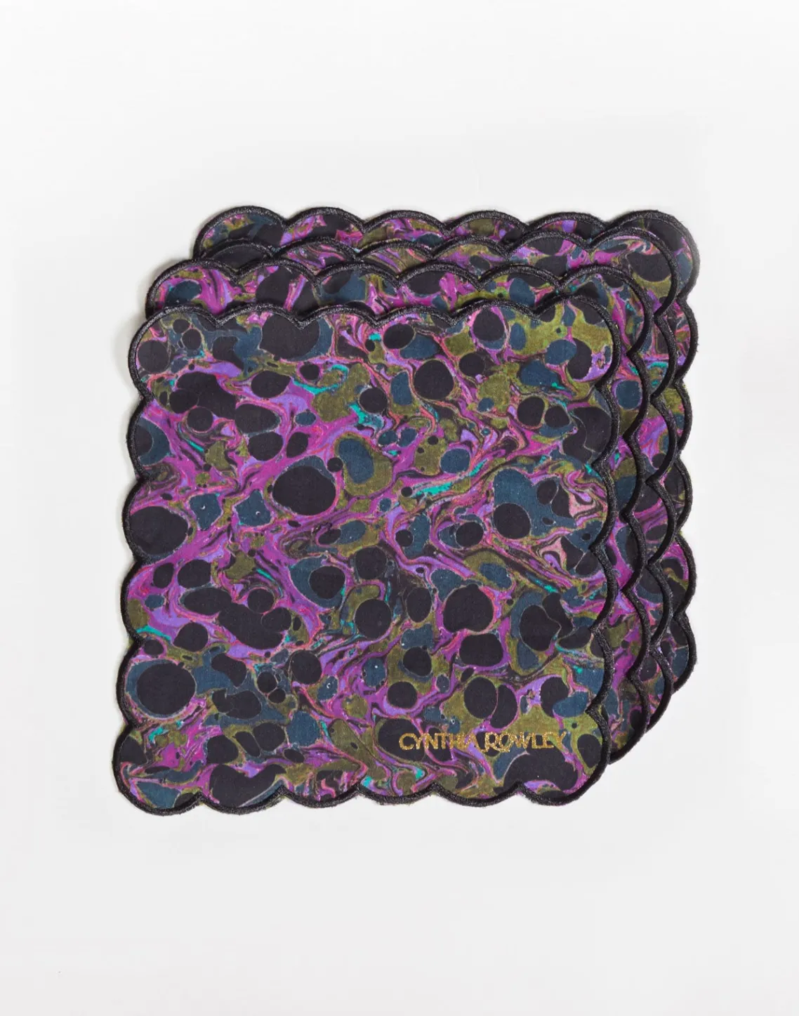 Printed cotton cocktail napkins with scallop embroidered edge.