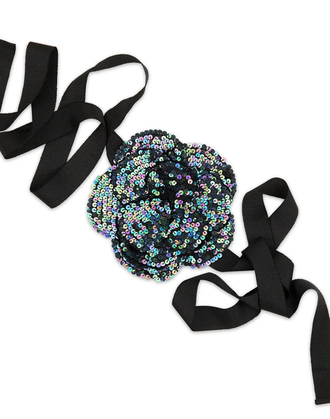 Sequin flower can be worn as a belt, hair accessory, or necklace.